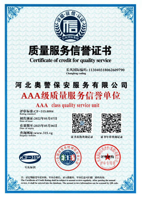 “忠誠(chéng)的伙伴,非凡的朋友”,河北奧警保安服務(wù)有限公司本著“客戶的需求就是我們的追求”的服務(wù)理念,與廣大客戶攜手并進(jìn)、共創(chuàng)恢弘偉業(yè)。